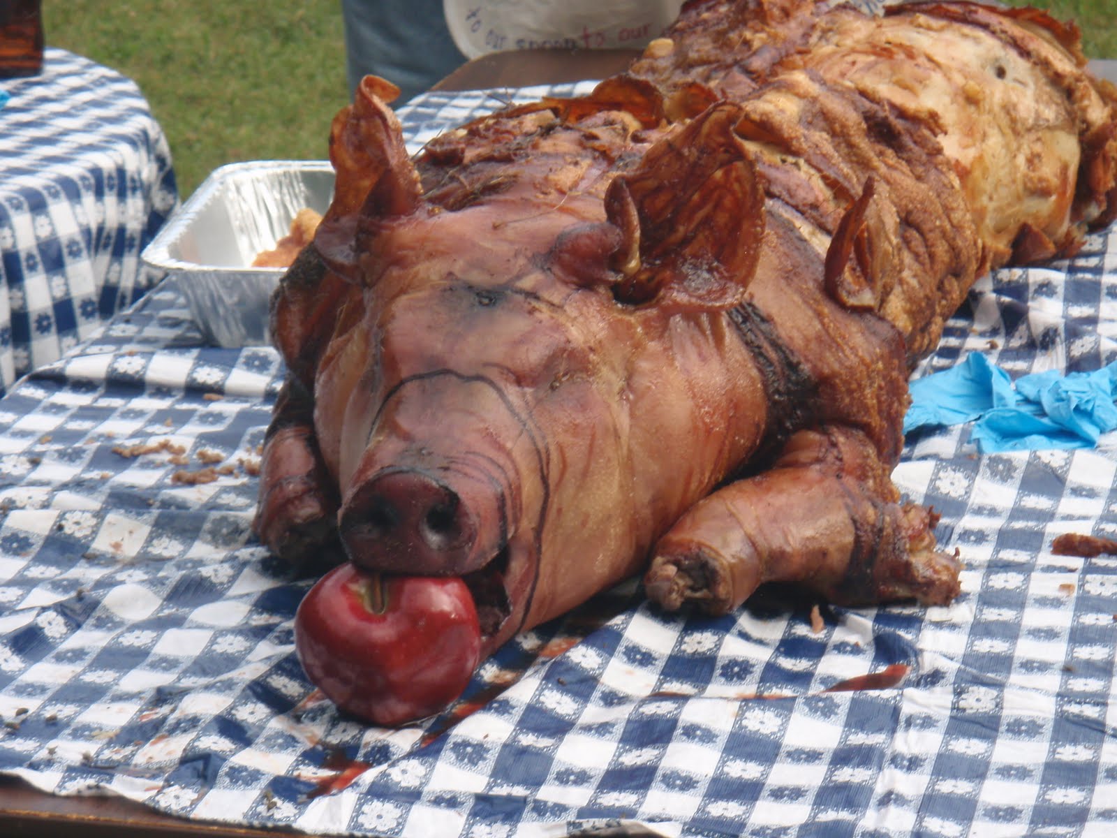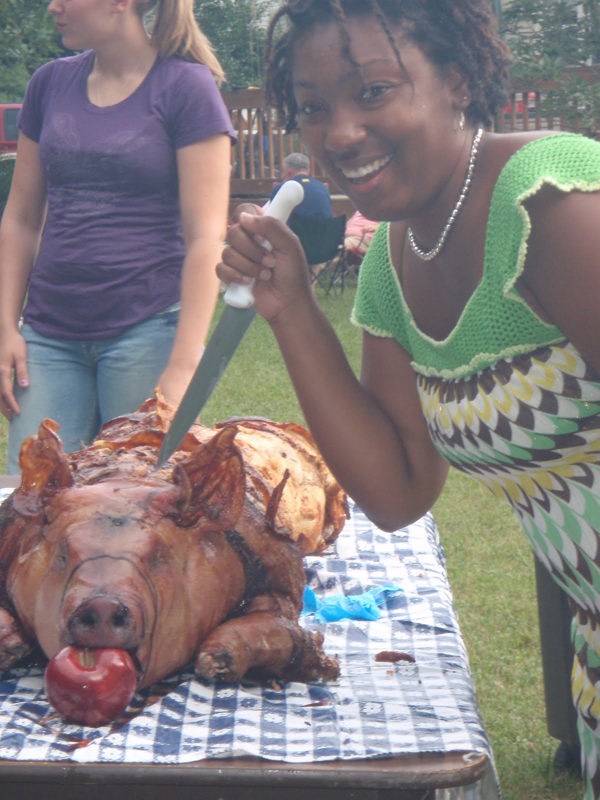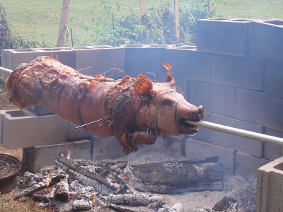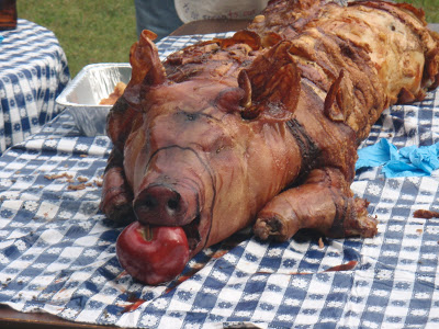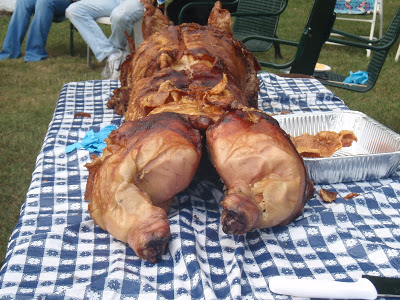 What a way to get started! Let me start by saying that we do not eat pork! This to me is a good example of why. Even if I did eat pork, I probably would have not eaten it after seeing the entire pig being roasted. My husband and I attended a pig roasting at the end of the this summer. Let me say it was a great experience. If you have never been to one you should definitely go! It was really interesting watching this pig turn on this pole. My understanding is it took almost 24 hours to cook this pig fully. Wow! Hope pork was on the dinner menu tonight!