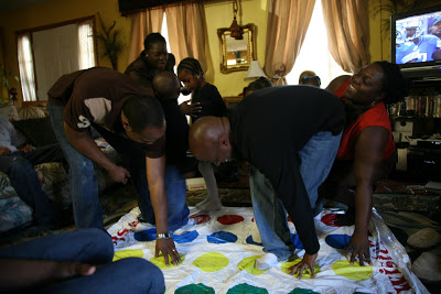 So if we aren’t nontraditional I don’t know who is! Yes this is three grown adults, two being men playing twister! I have some more interesting shots that I’m sure my husband would like for me to burn, but they are way to funny! The kids sadly got booted from playing twister so that my husband and his SoRHObro could compete in a game of twister. My line sister tried to get in on the action you can see my husband trying to knock her off the mat!