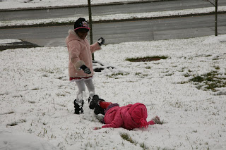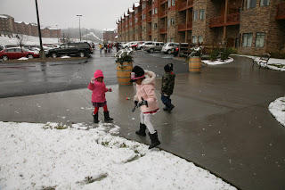 Bossy throwing a snow ball at baby girl!